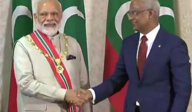 New Delhi: The Maldives government on Saturday conferred on Prime Minister Narendra Modi its highest honour for foreign dignitaries — ‘Order of the Distinguished Rule of Nishan Izzuddeen’. Modi received the award at a ceremony held at the President’s office in Male.