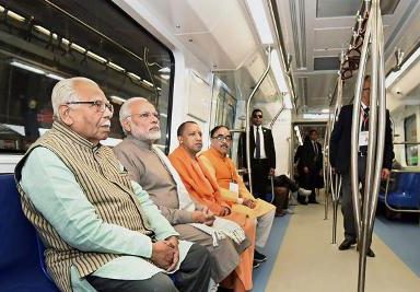 Modi flagged off the new metro, decked with marigold flowers, from Noida and took a ride on the train to the Okhla Bird Sanctuary station along with Adityanath.