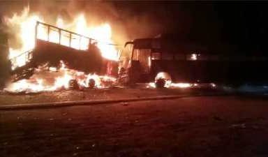 The sleeper bus, from Farukhabad was headed to Jaipur via Gursahaiganj in Kannauj district of Uttar Pradesh, collided with a truck on the GT Road. The accident was so severe that the oil tank of the truck exploded, setting both vehicles on fire.