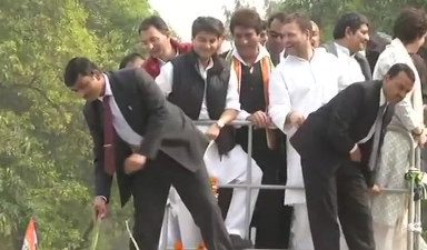 She along with Rahul Gandhi and Scindia then boarded an open truck decorated with garlands for the road show that would culminate at the party headquarters.