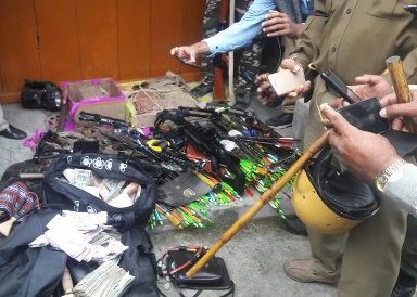According to police sources, huge cache of arms and ammunitions including bow and arrows, knives, axes and cartridges were seized from the house.