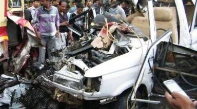 According to police, a bus proceeding to Mancherial from Hyderabad lost control and collided head-on with a truck coming from opposite direction on Rajiv Rahadari, as the highway is known. The truck hit the road divider and collided with a Qualis and a container lorry. The Qualis was crushed between the truck and container lorry.